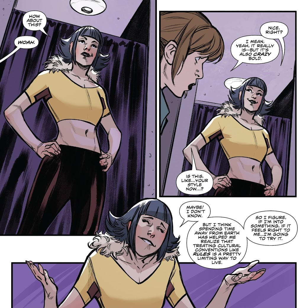 In the wake of everything that’s happened, Kimberly goes on a bit of a buddy tour, checking in with her various friends. She goes shopping and gets lunch from Trini, who fills her in on everything she’s been up to — including telling Kim about Shattered Grid and all those future Power Rangers they met! With the knowledge that they’re only some Power Rangers and not the Power Rangers, Kimberly is even more over a barrel about the whole thing. So she asks Billy to see if he can whip up some power upgrades.