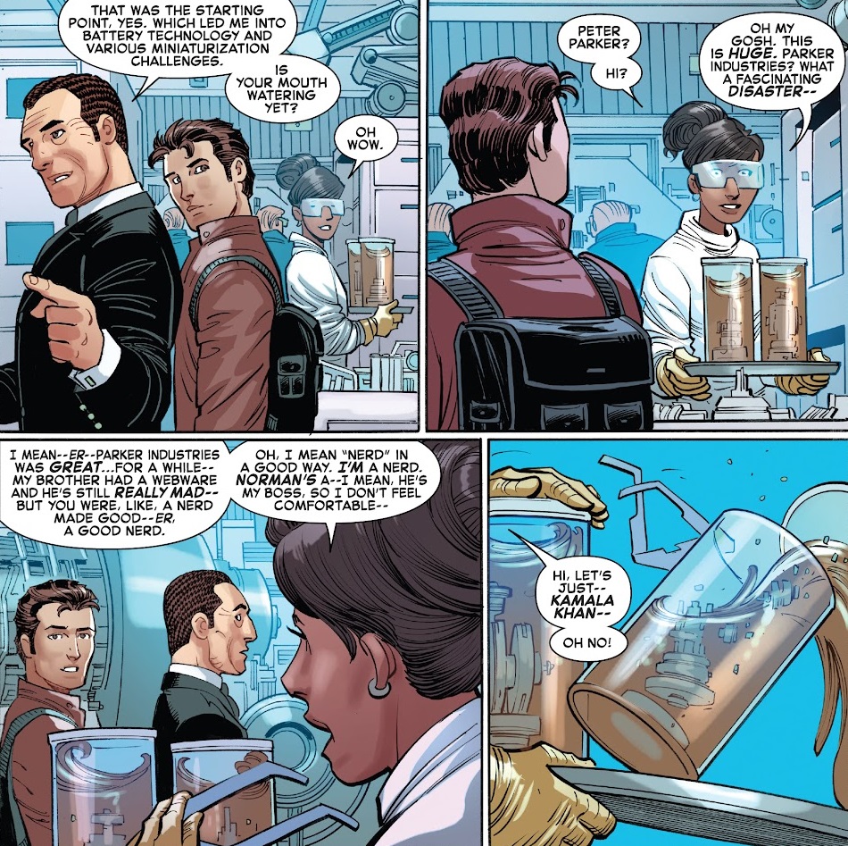 We open with Tiana Toomes confronting her grandfather, the Vulture, about all the murders he committed and walking out on her. Vulture blames Spider-Man for informing her about his past, and he swears revenge. Across town, Peter is meeting with the reformed Norman Osborn to get a tour of his new Oscorp. Norman wants to offer Peter a job. Then Peter has a run in with Mary Jane, and it’s lukewarm, to say the least. But Peter suspects it wasn’t a chance encounter and he confronts Norman, telling him off for possibly arranging this meet up with MJ. Peter storms out, while Norman reveals that they’ve been working on a new Spider-Man outfit and gear together.