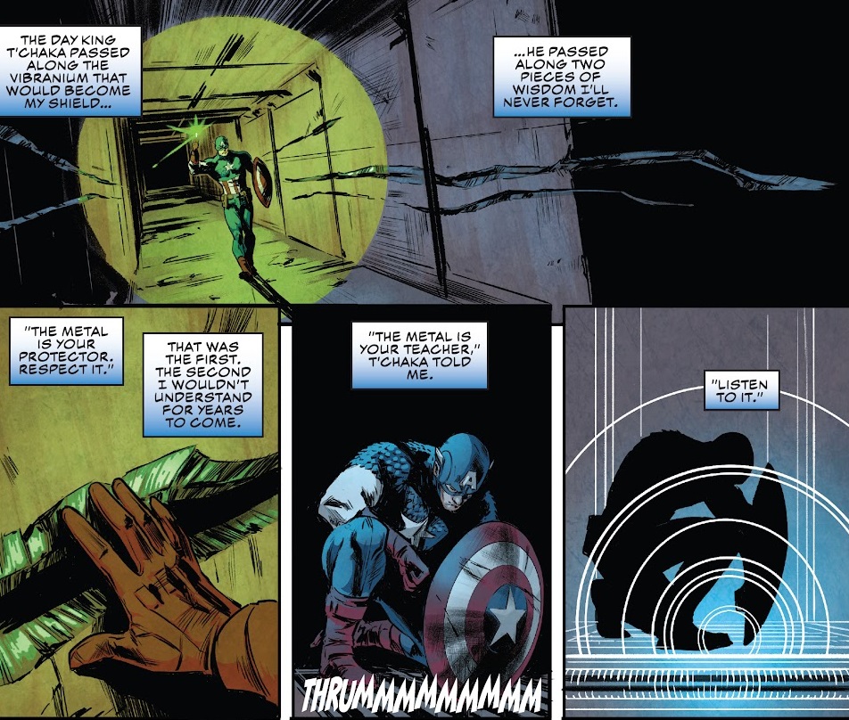 Captain America fights the robot dude, possibly named Redacted, and whips his butt pretty easily. Steve then heads into the Forge, where he discovers a volcano lair in the basement. He also finds a mold for his shield, and when he puts the shield back into the mold, a recorded message plays from the blacksmith, Dr. Boka Agboje. The doctor explains that the bad guys are called The Outer Circle, and they have been menacingly controlling everything from the background, like all retconned evil villain groups do. Agboje designed Cap’s shield to bring them into the light, in the hopes that Steve is awesome enough to defeat them.