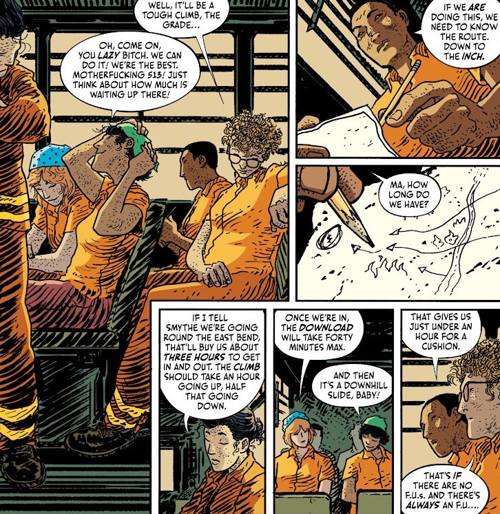 The first issue of this series served as good set-up, and this second issue continues the story nicely. Snyder doesn’t waste anytime getting on with the heist, and we actually get some moments of levity and character building this issue. The characters themselves are not so clearly defined on their own as of yet, but they work as a group. Like, I could go back to the first issue to refresh my memory of each individual character, but I don’t really feel like it. The main character, Ma, remains a strong enough focal point that I can focus on her and just accept the crew as a conglomerate.