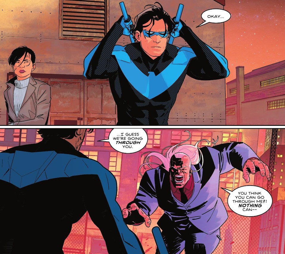 But those are simple nitpicks for an otherwise excellent issue, that features plenty of action, quality Nightwing moments and a shocking cliffhanger. The rescue of the mayor is cool as hell, and I’m glad they didn’t waste any time with it. Just some cool Nightwing action! Then the simultaneous takedowns rock, because it’s fun to note how connected Nightwing is with the superhero community. And the character stuff remains great, like the aforementioned Kate/Maggie drama and then just seeing Maggie put her foot down as the new police commissioner. Taylor is still building a really fun supporting cast.