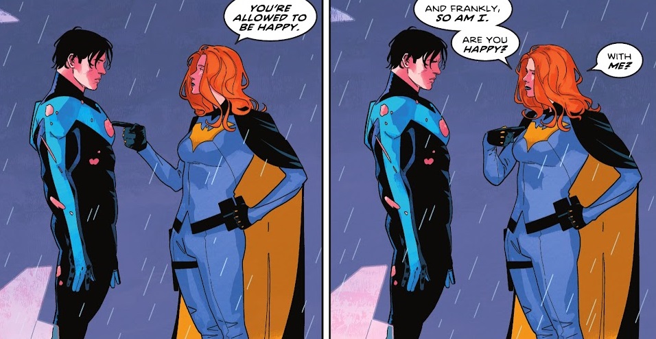 In the aftermath, Dick tells Barbara that they can’t be together now that a villain knows his secret identity, but Babs ain’t hearing it. She gives a nice speech about both of them being allowed to be happy, and they are going to stay together and face whatever storm is coming their way.