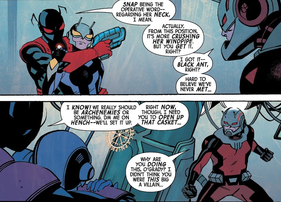 The Avengers have captured the merged Ultron/Hank Pym and have him locked up in a Vibranium coffin with Asgardian runes. The plan is to hide the coffin in a Microverse desert, and they’ve called in Scott Lang to make that happen — and Scott brought his daughter, Cassie, currently going by Stinger. When the Avengers get called away on a world-saving mission, Scott and Cassie take it upon themselves to enact the mission, which involves bringing the coffin to Hank’s old lab in New York. That’s when Ultron Pym reveals he’s been secretly communicating/influencing Scott, and when Scott turns down his request to help, the Black Ant reveals himself! Way back in the day, when Eric O’Grady was killed, he was replaced by a life model decoy who eventually became Black Ant, the evil Ant-Man. He takes Cassie hostage and they all talk it out.
