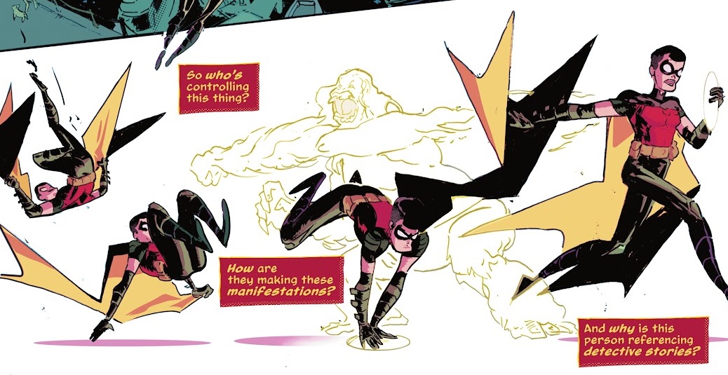 Tim Drake has moved out on his own to a house boat in the Gotham Marina, in an effort to help find himself away from the Bat-Family. He’s dating boyfriend Bernard, having recently come out as bisexual, and he’s got a friend in Darcy, a former We Are Robin devotee (the former doesn’t know his secret identity, the latter does). Then two of Tim’s neighbors are murdered, so Robin investigates, with the help of a police detective he’s formed a friendship with. Tim quickly deduces that the murder scene is staged like an Edgar Allen Poe mystery, and they’re soon attacked by a light construct orangutan — which is similar to a light construct elephant from a Mark Twain murder mystery that Tim faced in a recent Young Justice comic. So there’s a new villain staging murder scenes like classic murder stories, and they’re using light construct animals.