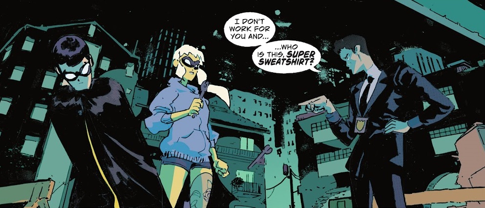 Just sayin’. Giving Robin a sidekick would be neat. Not that the Bat-Family needs more members, but I would be totally down for making Sparrow legit. But secret identities are totally still a thing, Darcy.
