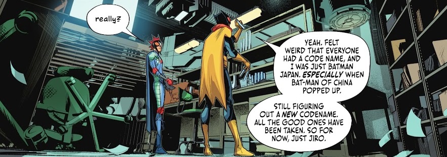 The issue itself is nicely paced, with a nice, solid use of the various characters. The mystery builds with each page. We visit a ton of different locations and check in on a bunch of different characters. The threat is clearly presented, even as the villain stays off-panel. And I really enjoyed the little character bursts we get. Batman Japan has an especially fun scene where he discusses with an ally about changing his code name, because “Batman Japan” is a silly code name. That should be a fun subplot. And Ghost-Maker works as a team leader, who not everybody is fully behind, for legitimate reasons. I look forward to seeing how this story and these characters develop.