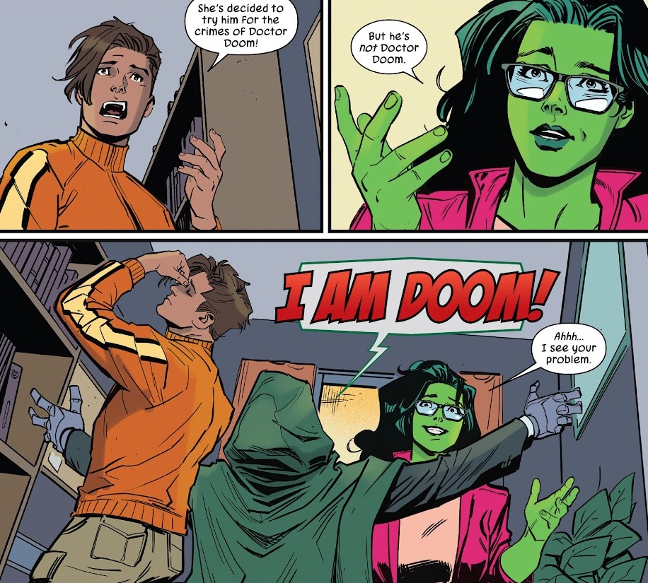 She-Hulk and Jack of Hearts have slept together and they share a cute morning together before Jen heads off to work on a Saturday to meet a mystery client set up by Awesome Andy. The mystery client is Doombot, from Runaways, and Victor Mancha has brought him to get legal help. Doombot was picked up on a traffic ticket, and the district attorney wants to prosecute him for all the crimes of Doctor Doom. Jen takes the case!