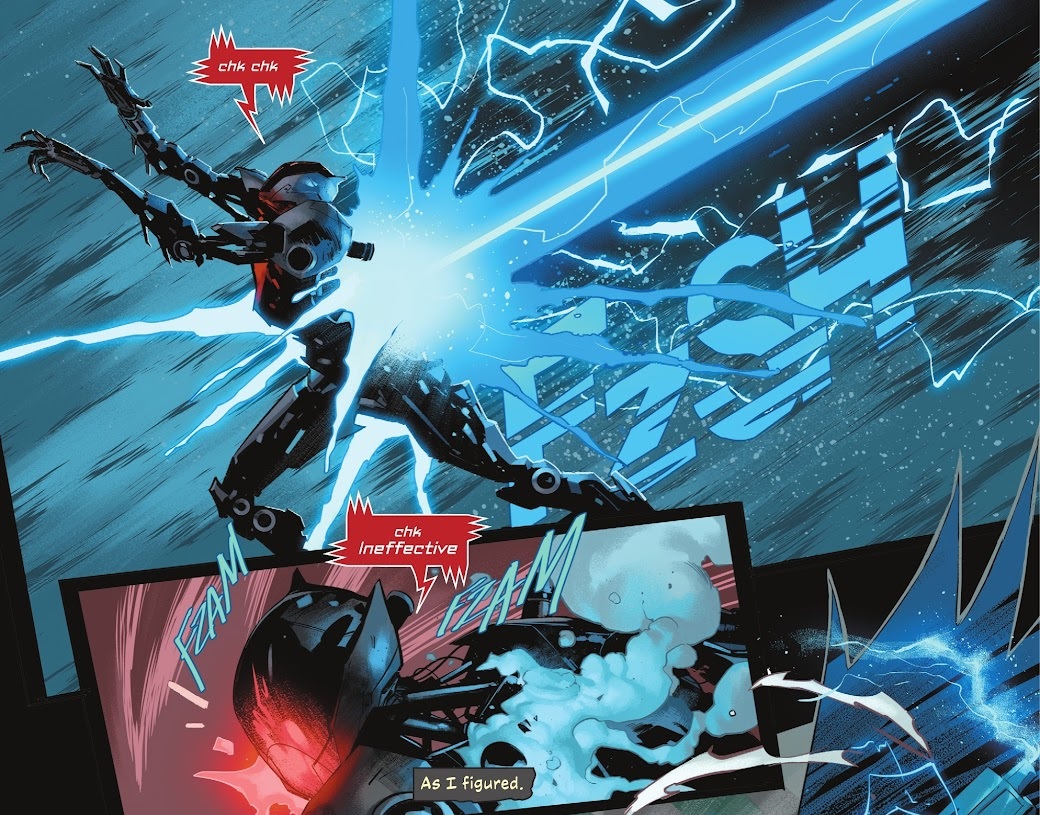 Nitpicks out of the way, it’s still a fine comic book story about Batman on the run and thinking on his feet against seemingly impossible odds. And that’s a fine, fun story. You can see the gears turning in Batman’s head as he figures out his next step. You can feel the desperation in his voice. This is definitely a unique, adrenaline-filled situation in which Batman is truly under the gun and has only minutes to come up with moves and plays. And Jimenez easily keeps up on art, delivering some great stuff with each page. This issue just isn’t particularly clever or engaging. It’s just this unstoppable robot being varying degrees of unstoppable. Almost too unstoppable.