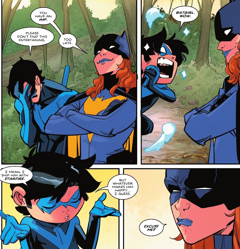 Nightwing and Batgirl have a villainous crime boss held prisoner…but their hideout is interrupted by a fifth dimension imp named Nite-Mite, who is Nightwing’s biggest fan! He causes all sorts of mischief, but he really just wants to help. In fact, he knows all about how Blockbuster traded the soul of his first born child to Neron, and those demons are coming to collect. So Nite-Mite gives Nightwing some enchanted escrima sticks, and turns Haley into a talking dog superhero, so that they can go and fight demons and save Olivia. Out heroes win the day and Olivia, who has some super strength, goes off with Raven in order to protect her from the forces of Hell. And Nightwing and Nite-Mite part ways as friends.