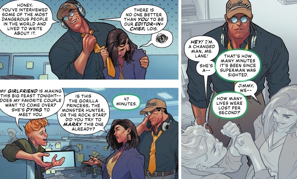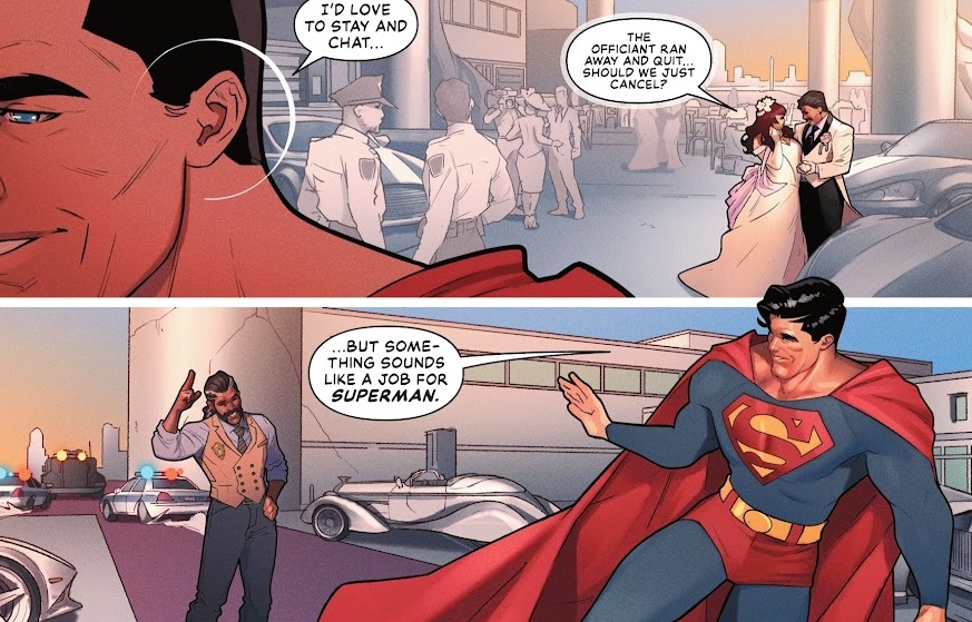 We open with an attack from Livewire. Classic. But she’s attacking the CEO of the broadcasting company that took her podcast off the air. It’s a fun modern twist to a classic super-villain trouble! And it leads to Superman having to step in as a wedding officiant, which is pitch perfect Supermanning, as far as I’m concerned. How fun! I also love everything to do with the status quo set up. Clark Kent is a secret identity again, and he’s hard at work at the Daily Planet, meeting deadlines and being a good reporter. He’s got Jimmy Olsen, and he’s got Lois Lane in the fun new position of E-i-C. Sounds good to me!