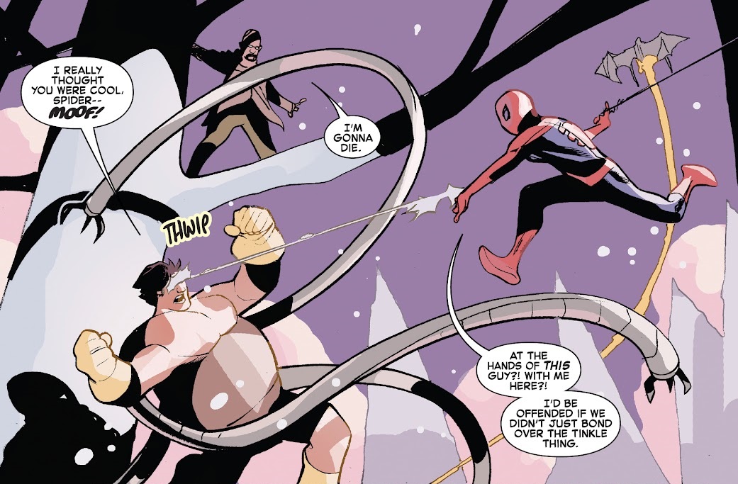 Spider-Man, Black Cat, White Rabbit and Kareem are on the run from a bunch of tech start-up punks wearing stolen super-villain gear, who are out to avenge the murder of their boss, Mychal. It’s a ton of fun as Kelly focuses on Cat and Rabbit banter, alongside Spidey and Kareem banter. Then even some Spidey/Rabbit/Cat flirting/banter. A wonderfully dialogue-focused issue. Eventually, the bad guys are defeated, and Spidey reveals that Mychal is alive and is simply invisible in his Mysterio costume. Our heroes turn the idiots over to the police, Kareem decides to get some respect from White Rabbit, and Peter and Felicia have a moment where he finally lays out his current feelings for Mary Jane.