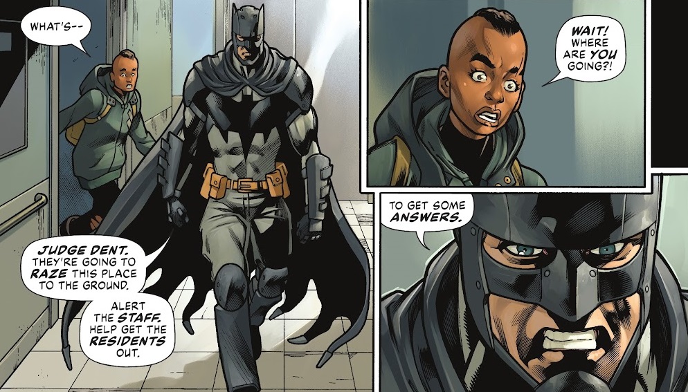 Bruce Wayne has cobbled together a Batman costume and gear and he goes on a crime-fighting rampage through Gotham, including beating up this world’s Riddler. He eventually digs up the corpse of this world’s Bruce Wayne and tests confirm he’s got multiversal energy about him. Batman then goes after Harvey Dent to get answers, but it’s Selina Kyle who might actually provide. She leads him underground to the Arkham Caves.