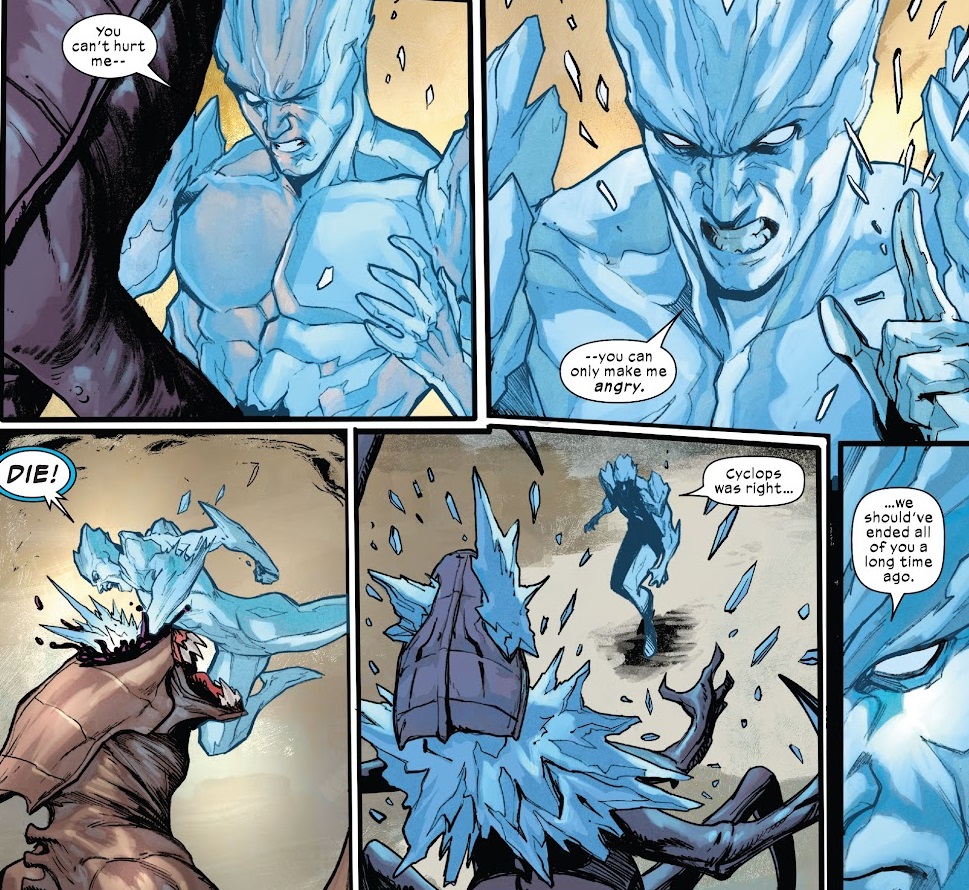 Weirdly, said cliffhanger doesn’t have anything to do with the rest of the issue, which mostly sees the X-Men battling the Brood and confronting Nightmare. It’s a pretty solid, pretty standard superhero threat, and I like what Duggan does with it. Iceman gets a scene to be a kickass hero, which is always good in my book. And we’ve got a sufficiently dangerous problem, with Nightmare in control of the Brood. I still think Nightmare is an odd choice of villain for an X-Men comic, but who am I to judge?
