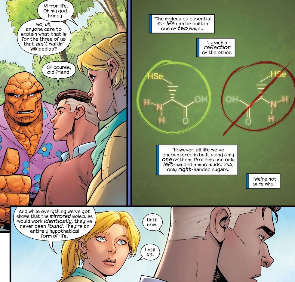 The Fantastic Four are driving to Aunt Petunia’s house, but they get intercepted by Nicholas Scratch and Salem’s Seven. He casts some kind of warping spell on the team and then takes off back to the Dark Dimension, with the Four unsure if he’d done anything at all. After stopping for lunch, they soon learn that their DNA, RNA and amino acids have been mirrored through fourth dimensional space, which makes them incompatible with the world, especially food. So they portal to the Dark Dimension themselves and Reed stretches his body and mind through fourth dimensional space to revert them back to normal. Buuuuut it seems like they may have brought some fourth dimensionally-mirrored bacteria with them, and that will collapse the global food chain.