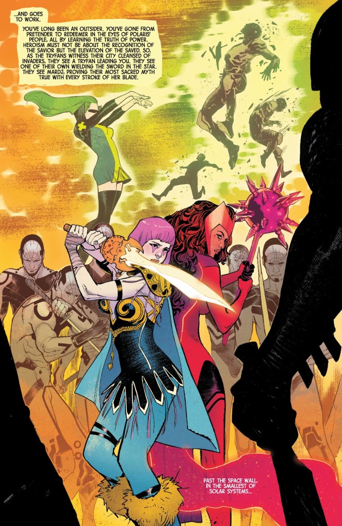 Polaris stops by to give some info about that magic stone Wanda got in the first issue, but then their chat is interrupted by the tiny arrival of Mardj, a warrior from Sub-Atomica. Her world has been invaded by some bad guys and she needs help reclaiming it. So Mardj, Wanda and Lorna go on a quest to reclaim a mythical sword and help Mardj inspire her people to fight off the invaders and win the day. Huzzah! Afterwards, Wanda returns to her shop to find it on fire, with Darcy kidnapped by Scythia, Champion of the Bacchae.