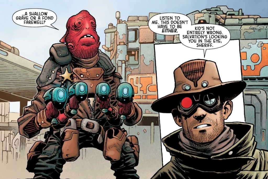 But it also wasn’t all that and a bag of chips. Nothing mind blowing. Nothing to really change the face of everything as we know it. Just the Guardians being themselves, back to some degree of basics. Lots of mysteries are set up that I’m sure will be explored. Various characters knock heads together. There are a couple stumbles, in my opinion. They try so hard to set up the cowboy gimmick and it doesn’t really fit. The second half of this issue is a huge rush to get everybody off planet. But the first half of the issue involves Peter riding an animal into town, just to get that classic cowboy opening. Then we find out that the entire team is already in town, yet they’re not evacuating people? What I’m saying is, the desire to dress up everybody as cowboys doesn’t exactly jive with the rushed evacuation.