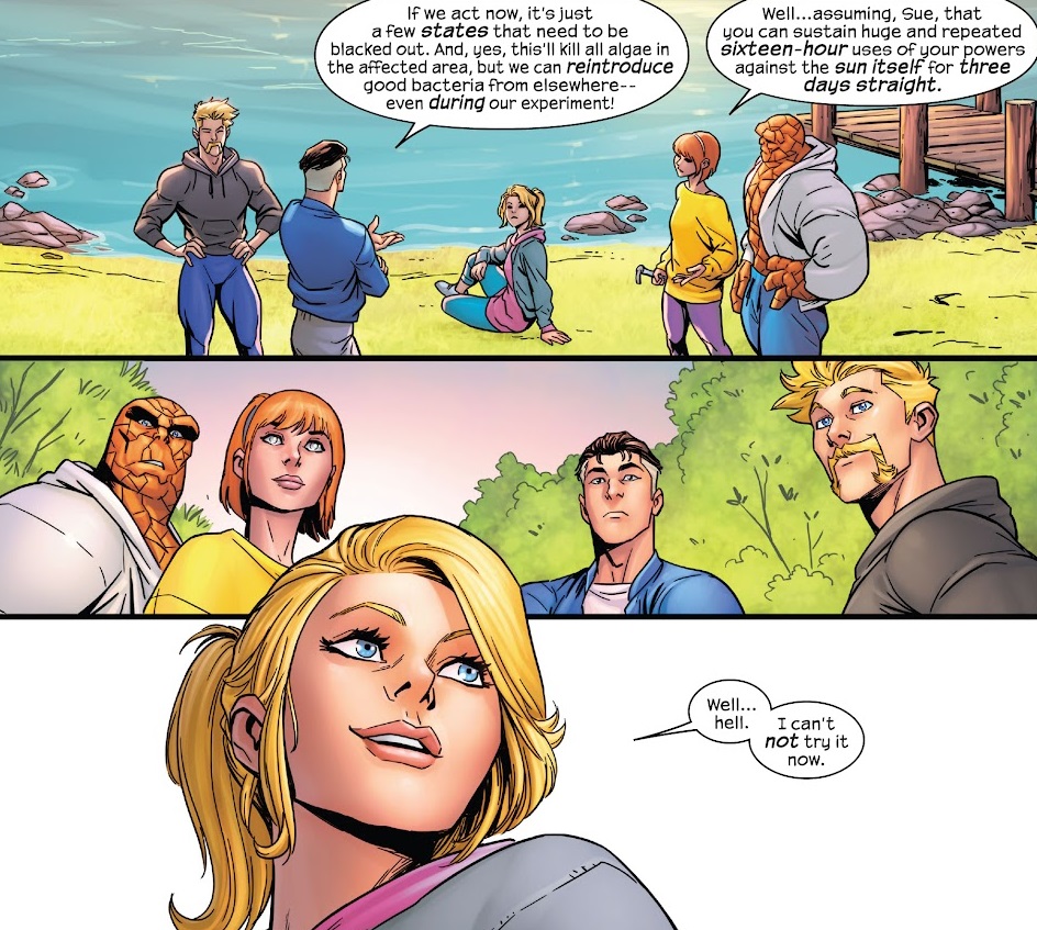 The Fantastic Four discover a nearby lake that has been infected with mirror bacteria, introduced last issue. They clean it up, but realize that the bacteria has likely spread to other nearby lakes, and is therefore moving too fast for just the five of them to clean up. So they science it out and decide that Sue is going to fly into space in order to make the sun’s rays invisible for large portion of the United States for three days to kill the bacteria — and plunge several states into total darkness for three days. Johnny goes to keep Sue company, while Reed, Ben and Alicia try to deal with an angry populace and some super-villains who try to take advantage of the darkness.