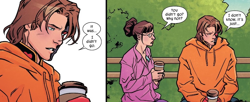 And now, since I stopped reading, Jack of Hearts gained all of his powers back, including his limitations. So now the two of them are in love but can’t physically be together, because of that nonsense. And in this issue specifically, they meet up and Jack says he’s dropped out of the poetry classes he was taking, because he’s so woe is me. It’s maddening!