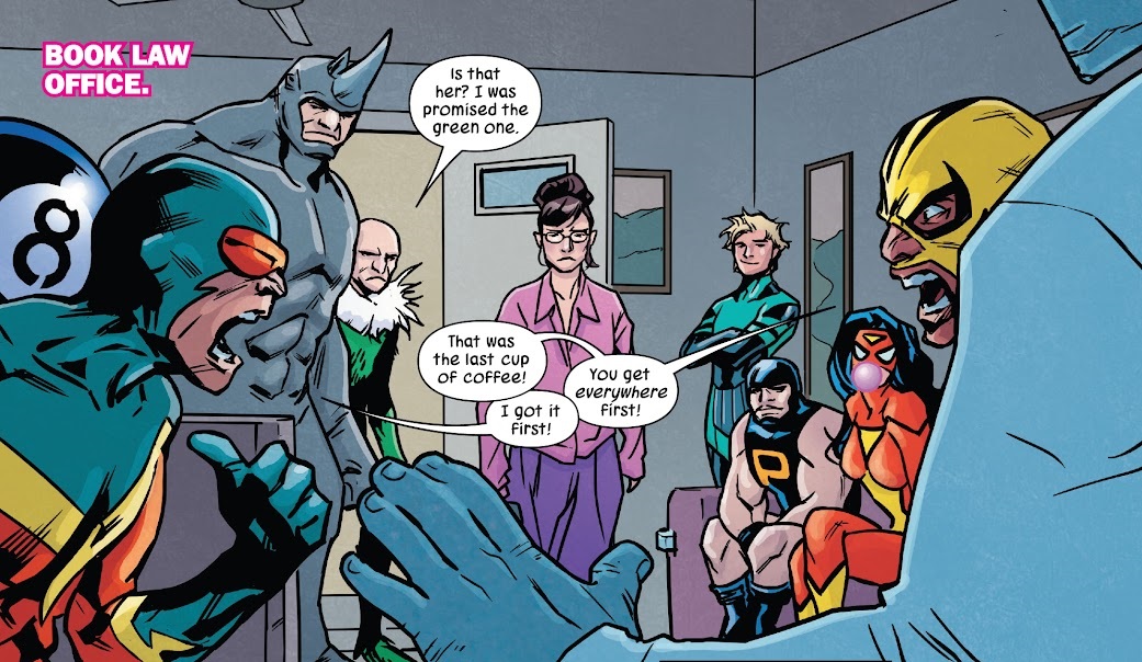And then it all ends with Captain America showing up to ask for She-Hulk’s help, something Janet alluded to in the kitchen discussion, so excellent foreshadowing. Then everybody races out to also help (including Volcana!), and the scene ends with Cap revealing that he’d read and enjoyed the book on his own. That’s a wonderful and funny little stinger to end the scene. That is how to wrap something up cleanly with a bow.