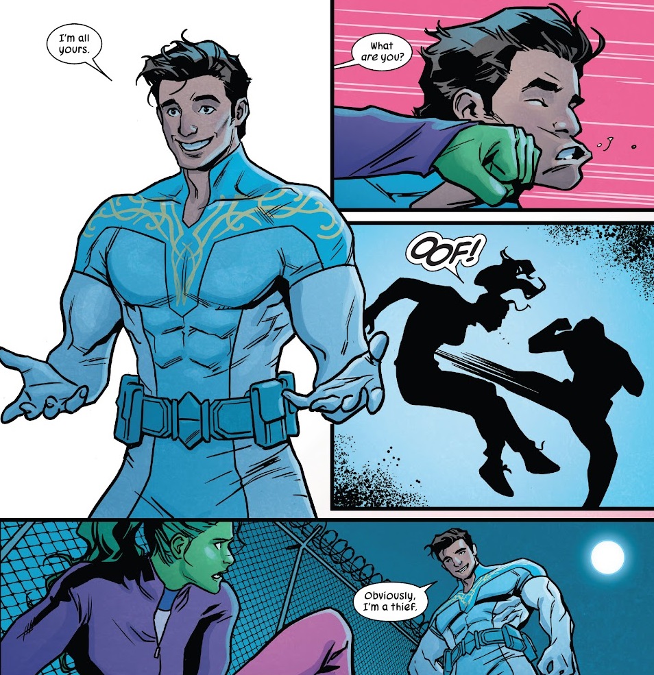 But even more fun is the new villain Rowell has introduced. For two issues now, this handsome, dashing scoundrel has gotten the best of Jen as she helps out the Fantastic Four on their mission. And, full honesty here, this is the sort of wooing that I’m talking about. This guy is just so damn charming! We don’t yet know his name, powers or larger purpose, other than trying to steal some secret government stuff, and Jen keeps haphazardly getting in his way. He’s able to withstand her punches and deliver them back, and he’s such a ham when bantering with her, which frustrates Jen to no end.
