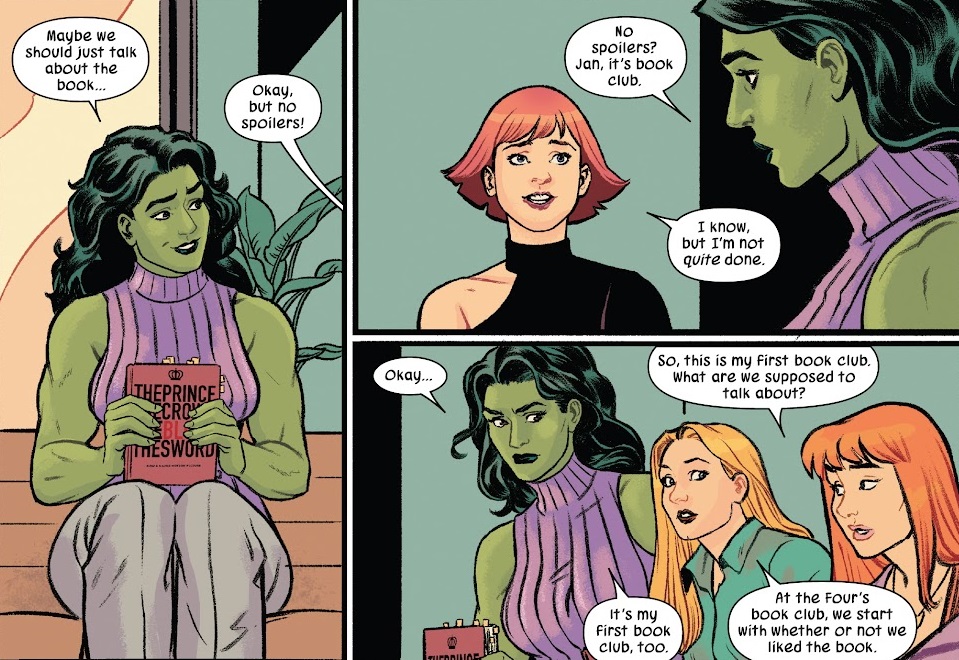 In a wonderful backup story, Jen hosts a book club and invites her superfriends: Sue, Patsy, Jan, Colleen, Misty and Volcana! Some heads butt because not everybody has read the book, and because Jen thinks Jan is babying her. Jen and Jan have a heart-to-heart in the kitchen, where Jan explains that she feels like she owes Jen a huge debt because of how her life has gone. Jan gifts Jen the apartment, and then Captain America shows up to get some Avengers back-up! Also, he’s totally read the book.