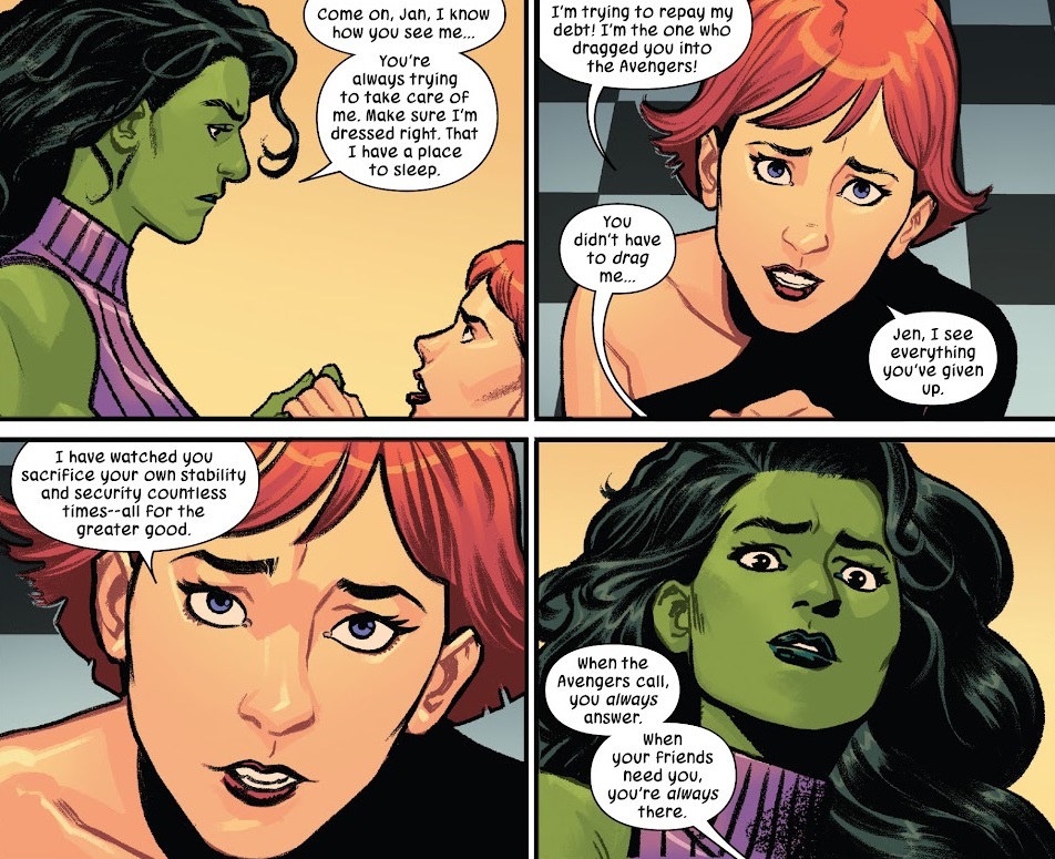 It’s a masterclass in friendly bantering between familiar characters. And it all builds to an excellent confrontation where Jen and Jan hash out what’s going on between them, which was excellently set up throughout the scene. Jen feels like Jan is overbearing and babying her, where Jan has always felt a little guilty at bringing Jen into the Avengers and turning her life upside down, so Jan uses her wealth to overcompensate. It’s a great scene between the two, as these longtime friends settle a very reasonable, very realistic problem between them.