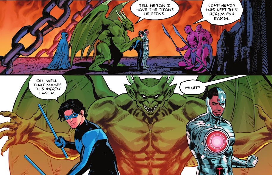 I also really enjoy how the story is going. I love that Nightwing’s plan revolves around using bureaucracy to dispatch Neron’s deal. That sort of thing is just funny. And it ties into Dick’s current connections with Bludhaven City Hall, so it all comes together in a nice bow. I appreciate clever writing like that. This may all still come down to a Nightwing vs. Neron fistfight, but I love clever handlings of superhero issues. And that has been a longtime staple of Tom Taylor’s work, especially this Nightwing comic. So let the good times roll!