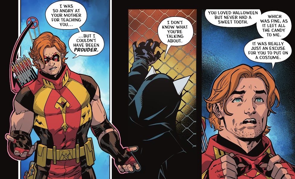Oliver Queen is missing in the multiverse after the events of Dark Crisis, and Black Canary, Roy Harper and Connor Hawke have tracked a lead on his whereabouts to Gotham City. They face off against a van full of hench-goons and are aided by teen vigilante Cheshire Cat, a former sidekick of Catwoman’s. Before she can slip away however, Roy reveals that he knows Cheshire Cat is his daughter, Lian, and they have a heartfelt reunion. The reunion is cut short when she and Connor are teleported elsewhere.