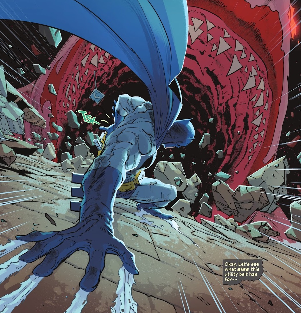 Batman eventually catches up with Halliday in some ruined, floating city at the end of existence and beats him up. Batman has a device to get home, but he realizes he needs to use it to send Halliday back to his home dimension, because Batman can’t just leave him to die. So that means Batman is stuck at the end of time and space…which is when Robin shows up, having completed his mission to rescue Batman.