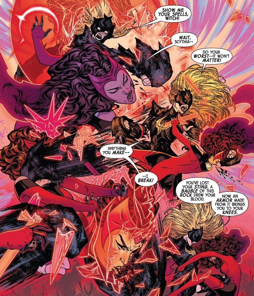 TL;DR: The first storyline wraps up with a truly awesome superhero brawl, that is both emotionally satisfying, and works wonderfully for the characters involved. This first storyline has laid a very strong foundation for the new adventures of the Scarlet Witch.