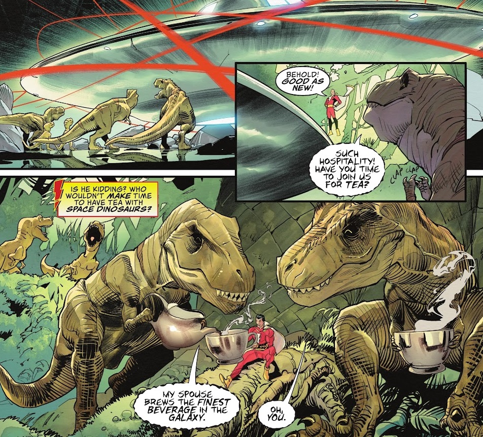Billy Batson is living a pretty good life as the Captain. He saves intergalactic dinosaurs, hangs out in his own personal clubhouse, the Rock of Eternity, and he’s got his foster brothers and sisters — though magic has been weird lately, and they’ve mostly lost their powers. He still goes to school, and he runs a Captain fan-site as a side hustle. But there are some mysterious, godlike beings lurking in the shadows. And when he goes to save people after an earthquake in Southern California, they strike. Billy is being interviewed on live TV and suddenly he turns into a raging, angry asshole, shouting at the innocent victims he’s just rescued that they are filthy and should be grateful he bothered with them.