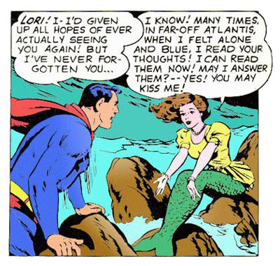 My friends, sit right back and hear the tale of Superman’s mermaid girlfriend. As we all know, Superman’s greatest love is Lois Lane. And when he was in Smallville, he had a high school girlfriend names Lana Lang. But did you know that he dated a mermaid in college?! I’ll grant you, this was all a bunch of Golden Age silliness, but Lori Lemaris was a mermaid who hid her fishtail with a wheelchair and a blanket, and Clark Kent was even going to propose marriage before she revealed that they couldn’t be together, seeing as how they’re from different worlds. When she was brought into the modern day, Post-Crisis DC Comics, a lot of her origin was maintained, and she was given the ability to turn into a human with legs whenever she was dry — just like the movie Splash! Because hell yeah!