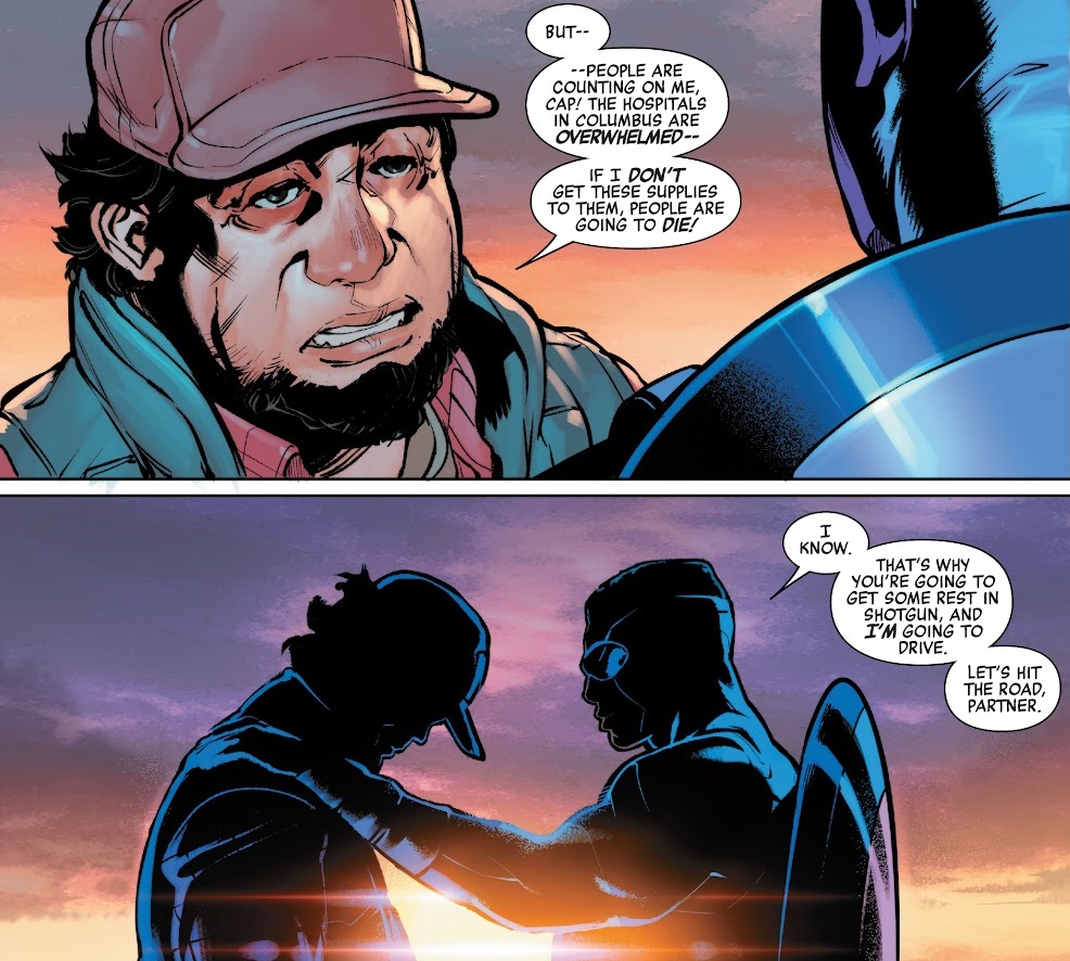 I like the general idea at the heart of this story. Kang the Conqueror has got something going on, so he uses his knowledge of future events to bribe the Avengers with the chance to save 1,000 lives in 24 hours. MacKay makes great use of this idea, and we get a ton of little scenes in this comic of the Avengers saving people in fun and heroic fashion. I really liked the scene where Captain America stops a trucker from getting on the road hopped up on pills, then volunteers to do the driving himself because the trucker was bound for a hospital with much-needed medical supplies. It’s a fun little scene.
