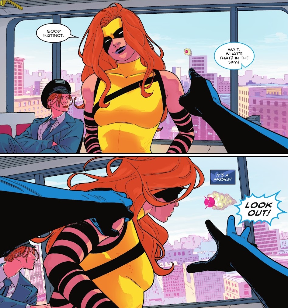 Shortly after waking up, Nightwing is told that Double Dare have stolen a biological weapon and are escaping on the M Train. Nightwing and Batgirl head out and get on the plane, where they find one of the twins fleeing for her life. She explains that she has been injected with a vaccine, which she and her sister were hired to steal from Shel Pharmaceuticals by the country of Vlatava. They have a virus, and Shel is charging too much for the vaccine. And they kidnapped her sister.
