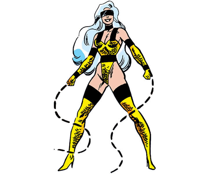 Speaking of snake/whip ladies, here is Coachwhip, a member of the Serpent Society! She has no super powers, just a pair of whips. Sometimes they’re electrical whips. Coachwhip has been through all sorts of Serpent Society adventures, and has worked with Viper too. I couldn’t find any direct evidence that she and Snake Whip ever hung out, but I hope they did off-panel. I don’t know if she’s blind, based on her mask there. That would make her pretty cool if she was a blind whip master.