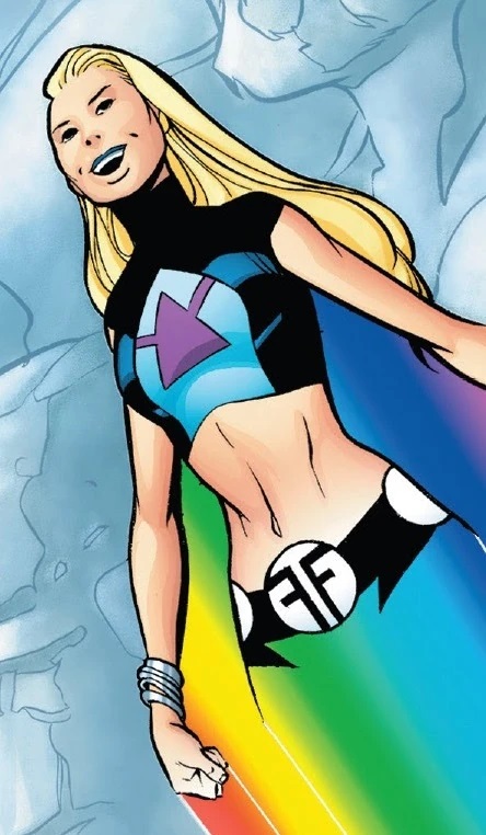 One of the sisters on the Power Pack, Julie Power has really come into her own in modern day comics. She’s got the power of flight, mainly, and that flight includes a rainbow streak behind her. She can sometimes use this streak for other things, but mostly Julie just flies and looks awesome. Julie is also the only confirmed — I think — LGBTQ+ rainbow character on this list. So that’s pretty neat!