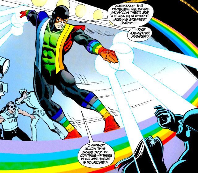 Rainbow Raider is a classic Flash villain. He has special goggles that launch beams of rainbow light, which he uses to surf and slide along to get to his crimes. His dying father built the goggles in an attempt to overcorrect for Rainbow Raider’s colorblindness. He immediately put them to use committing crimes and becoming a super-villain. He was just that evil. And just that flashy with his rainbow costume and sense of style. The best thing of all is that his real name is Roy G. Bivolo, because comic creators are mad geniuses.