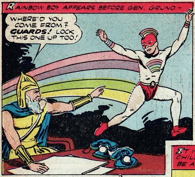 Oh boy, oh boy, it’s all been building to this! Rainbow Boy is a kid sidekick from 1942, from the pages of Reg’lar Fellers Heroic Comics. I already love it. He’s the only character on this list whose powers are actually connected to rainbows. When light is shining on him, Jack Walton gains the power to fly at the speed of light, while trailing a rainbow behind him. He can also use this rainbow trail to grab bad guys and make shields. He started out as one of those teenage radio geniuses that the 40s loved so much, then became the sometimes sidekick of Hydroman. That rainbow mohawk is as cool as superhero costumes get. And best of all, Rainbow Boy is in the public domain, so surely somebody can give him a modern reboot one of these days!