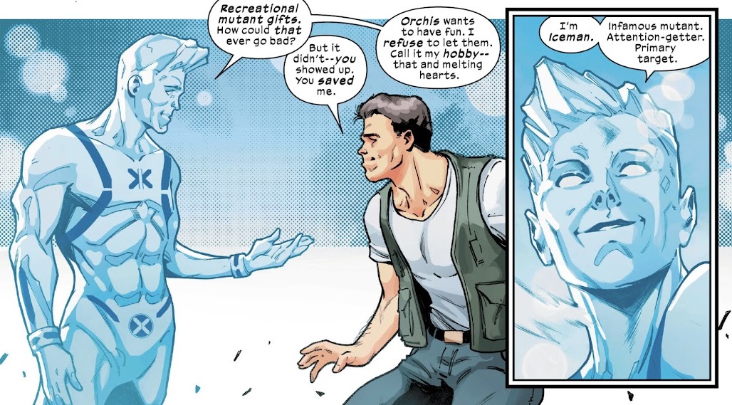 After the attack on the Hellfire Gala, Iceman is still alive and fighting bad guys the world over. He saves a guy in San Francisco who once took some mutant growth hormone and was targeted by Orchis. We soon learn that Orchis specifically targeted that guy to draw Iceman out. When the day is saved, a very tired Iceman retreats to his castle in Antarctica and we learn how he survived: his boyfriend, Romeo, the Inhuman, was able to collect Iceman’s emotional essence and put him back together, though it’s not permanent and is in danger of falling apart all over again. Still, Iceman is in good spirits.
