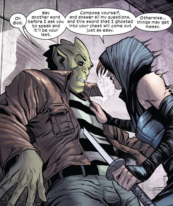 After Orchis attacked the Hellfire Gala and shut down the Krakoan gates, Kate Pryde fell through one at long last and wound up in Jerusalem. We find out that she brutally murdered all of the Orchis guards there because she knew that war had begun and she needed to keep her secrets. She then became Shadowkat, the silent ninja, capable of moving between gates and checking in on allies. She visits Mars to see that it’s a civil war, and she meets Woofer, the guy from a few issues ago. She visits with Synch, who is running a squad of X-Men from the sewers. We also check in on the Unity Squad, an imprisoned Cyclops, Emma Frost, Forge and Ms. Marvel.