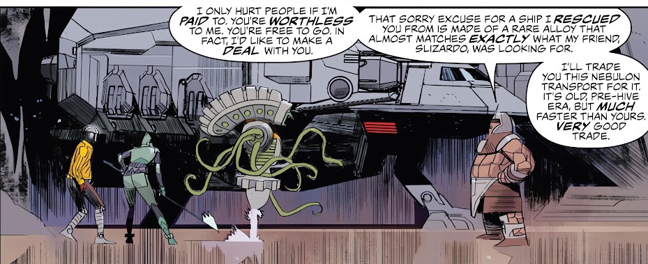 Darak and Solila flee deeper into the Skuxxoid ship (he’s not that concerned) and face off against a giant, robot scorpion, and team up with a Quintesson prisoner to make their escape. When they bump into the Skuxxoid again, he’s pretty chill about the whole thing because there’s no bounty on their heads. So he trades them a working ship for their old hunk of junk (wants some alloy from it) and the Quintesson. Darak and Solila take the deal and head for home, trying to think of the best way to approach both peoples. But when they get close, Solila knocks out Darak!
