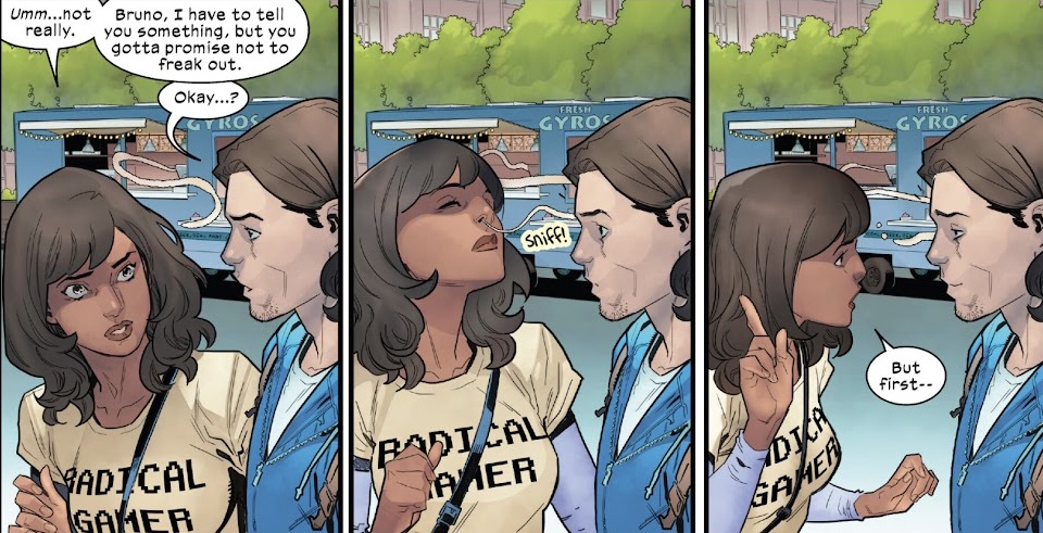 Again, I’m nitpicking at the little things. Like how on the nose it is that Kamala specifically brought her new X-Men costume with her to school instead of one of her classic costumes, and how just wearing that costume and being associated with the X-Men is enough to get her classmates to turn on her after she saves them. It’s somewhat ham-fisted in getting its point across. Which, again, is probably the point because it’s got to appeal to a wide audience.