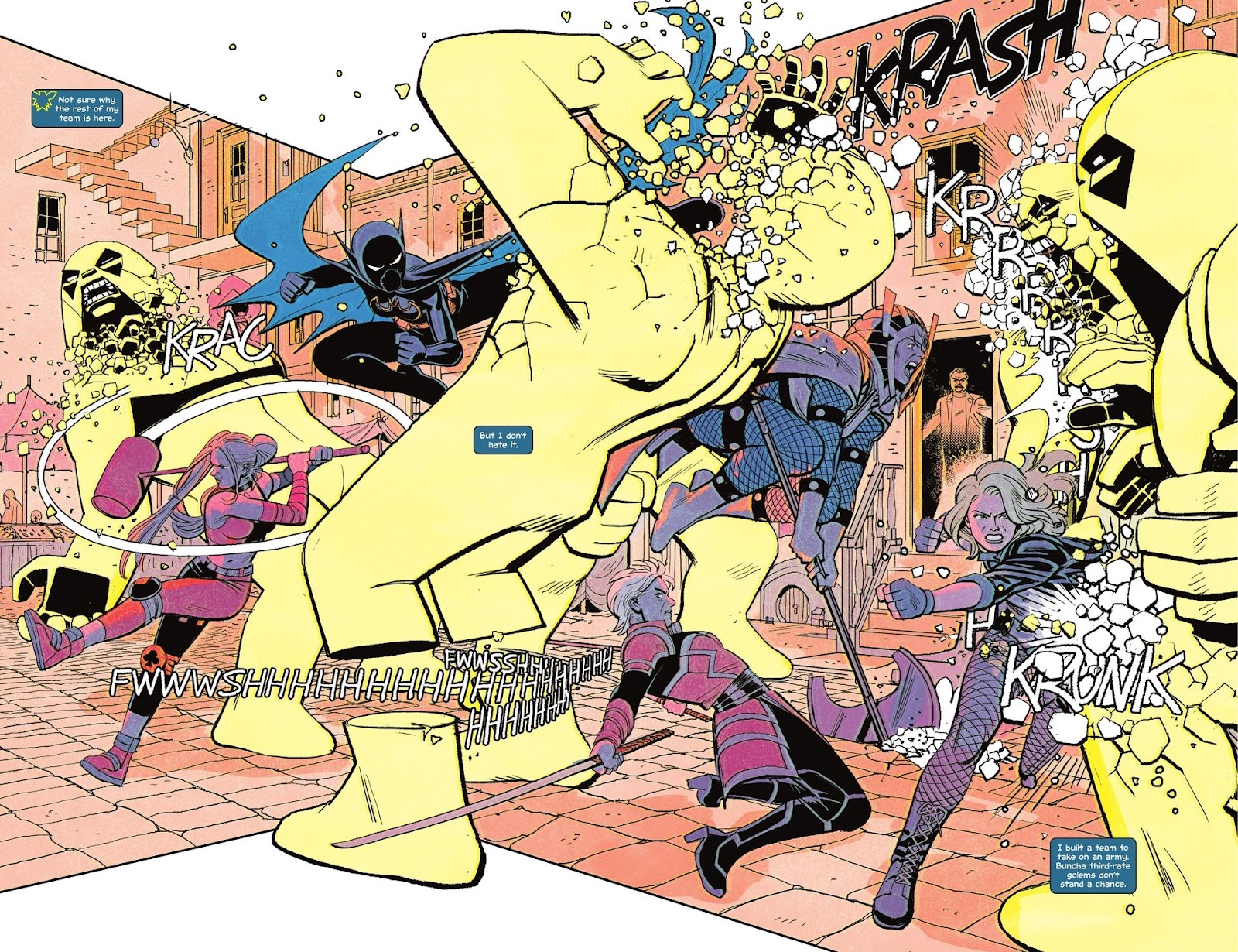 This issue does a lot of cool things with artwork and coloring. The opening flashback of Dinah and Sin is bathed in green, as they have a cookout in the woods. And then there are just some really awesome visuals as our heroes all pass through the white space around the panels in order to enter the black magic market. It’s a little weird that all of their individual errands had them going to the same mystical market, but I can overlook that bit…even though the comic calls itself out on the strangeness of everybody ending up in the same place. Still, no biggie. It looks cool and leads to a fun action scene as the team works together for the first time to fight some visually striking golems. Like I said, the visuals are really damn cool in this issue.