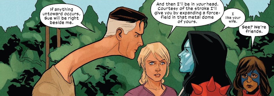 In an effort to get some new information to help them, Synch, Talon, Ms. Marvel and Rasputin IV go and visit the Fantastic Four on their farmstead. Rasputin is a real no-nonsense knucklehead about the whole thing and threats or attacks everybody. It’s more dumb than cute. Anyway, she has psychic powers, so they use a Cerebro helmet on her to try and recover the memories that Professor X erased in Mr. Fantastic’s mind, but it doesn’t work. Then Ms. Marvel gets to chatting about her combined Inhuman/mutant deal, and Mr. Fantastic realizes that he’d figured out a way to use a low dose of Terrigen Mist to mask the X-gene. So he’s gonna get to work on something that can do that for the X-Men.