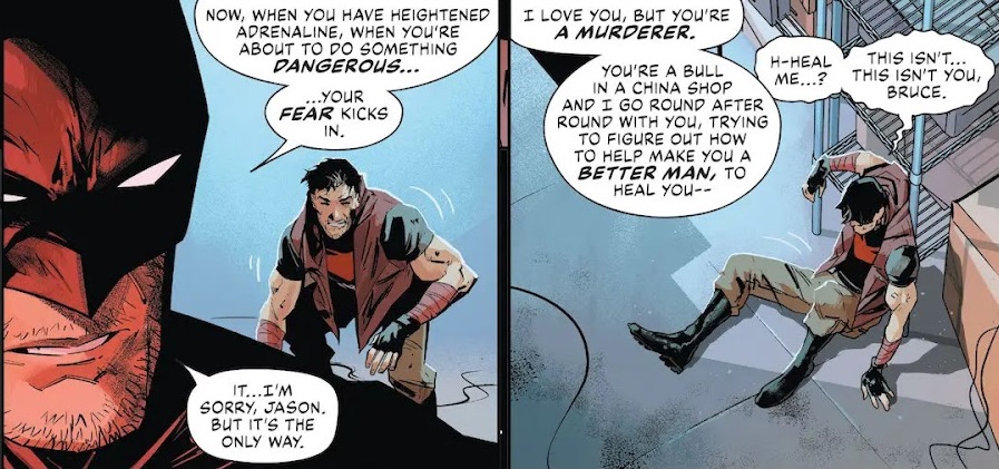 Batman has kidnapped Red Hood and injected him with a chemical that ups his fear response whenever he starts to get excited or ready for action. Meanwhile, Dick Grayson heads to a secret Bat-Computer in order to lock Bruce out of the systems. But Bruce and Damian know he’s going to do that and arrive to stop him, so Tim shows up to keep them at bay while Dick and get to work. Dick quickly learns what Bruce has done to Jason and he’s royally pissed off. But Bruce has given fully to Zur-En-Arrh at this point, and he abandons Dick, Tim and Damian to the police (they get away).