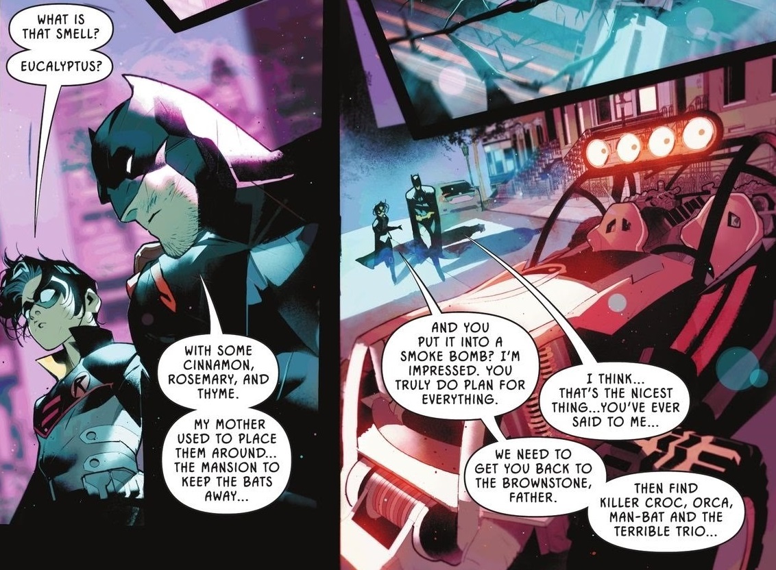 And, unfortunately, that little bit of high school we get is pretty cliche. No sooner does Damian, who seems pretty cool, walk into that school than some generic bully character steals his notebook and reads all his doodles and makes fun of him for it. Really? Damian Wayne gets bullied within the first 10 minutes of being at this school? It felt trite. And then Damian skipped out before the start of his first class. That’s fitting with his character, but who cares? So Robin goes out to fight some more bad guys? How is that more interesting than Damian forced to suffer through his first day of high school? I suppose this is just a me thing, and it’s just what I want, but it swerved this issue in a direction I don’t care for.