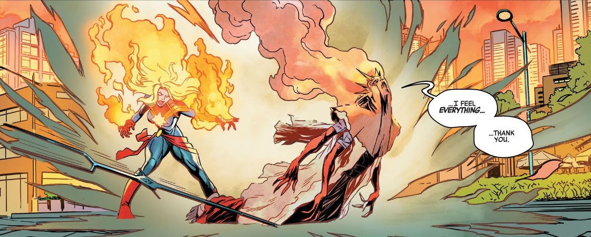 In a backup story, by Kalinda Vazquez and Alba Glez, random Marvel hero Firebird teams up with Captains America and Marvel to help a little girl who managed to summon some alien lights.
