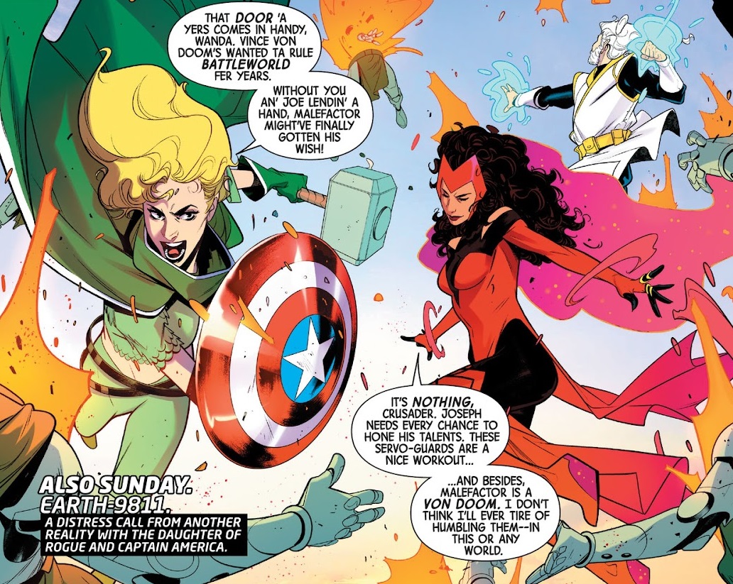 Wanda takes Joseph on a series of adventures over the course of a week that essentially involve Orlando flexing his knowledge about obscure Marvel characters. Or maybe he’s made some of these up. I don’t know. She helps Omega the Unknown fight off some possessed goat zombies. She visits the likes of Ganymede, Man-Thing, Jennifer Kale and even Crusader, the alternate reality daughter of Captain America and Rogue from What If…? #114. which I had as a kid and really enjoyed, and holy crap you guys, Orlando pulled Crusader out of his bag of tricks?! I already loved this comic, I didn’t need to fall in love with it!