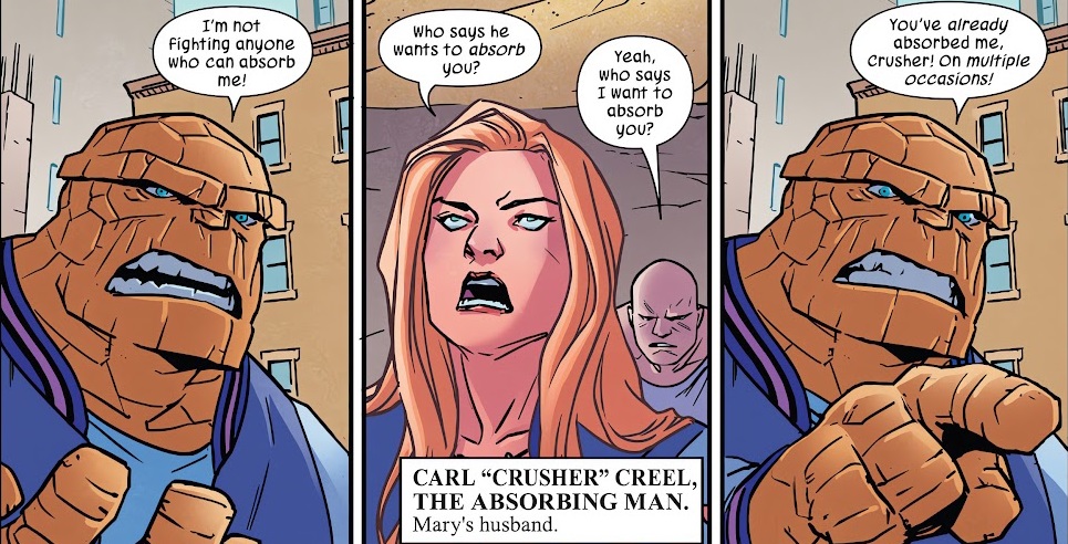 Jennifer and Jack of Hearts are still hot and heavy, having learned recently that they can touch one another if Jack has absorbed his limit of radiation already. Oh well. Jennifer heads to work and takes an eviction case from two Deviants, Karkas and Ransak the Reject. They’re funny. She heads to Punch Club later, but Titania has brought her husband, Absorbing Man, and he’s spoiling the mood. Jack shows up to join in and Absorbing Man attacks him, and it gets out of hand. The mood is totally ruined Crusher storms off. Jennifer tells Jack she needs to talk a walk and will meet him at home later. Then she runs into the Hulk.