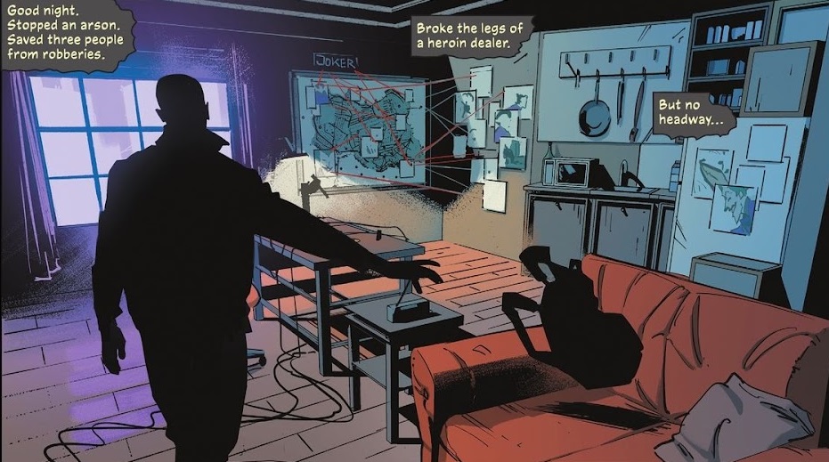 Batman is on his own, cut off from all allies and resources. But he still goes out to fight crime, and is working to track down the Joker. A murder scene and a Joker set-up lead him to an old mansion, and some other Joker taunts. The villain knows Bruce’s true identity now, and he uses that to ill effect. When Batman finally finds Joker in the old house, the Joker convinces Zur-En-Arrh to come out to play instead.